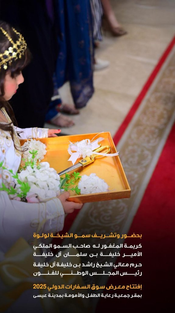 admin2025-07-18T00:35:56+03:00بحضور سمو الشيخة لولوة كريمة المغفور له صاحب السمو الملكي الأمير خليفة بن سلمان آل خليفة حرم معالي الشيخ راشد بن خليفة آل خليفة رئيس المجلس الوطني للفنون . و بتشريف الشيخة عائشة بنت راشد ال خليفة أقامت جمعية رعاية الطفل والأمومة سوق السفارات الدولي 2025 و ذلك يوم الأربعاء الموافق 7 مايو 2025 الساعة 10:30 صباحاً بمقر الجمعية بمدينة عيسى .